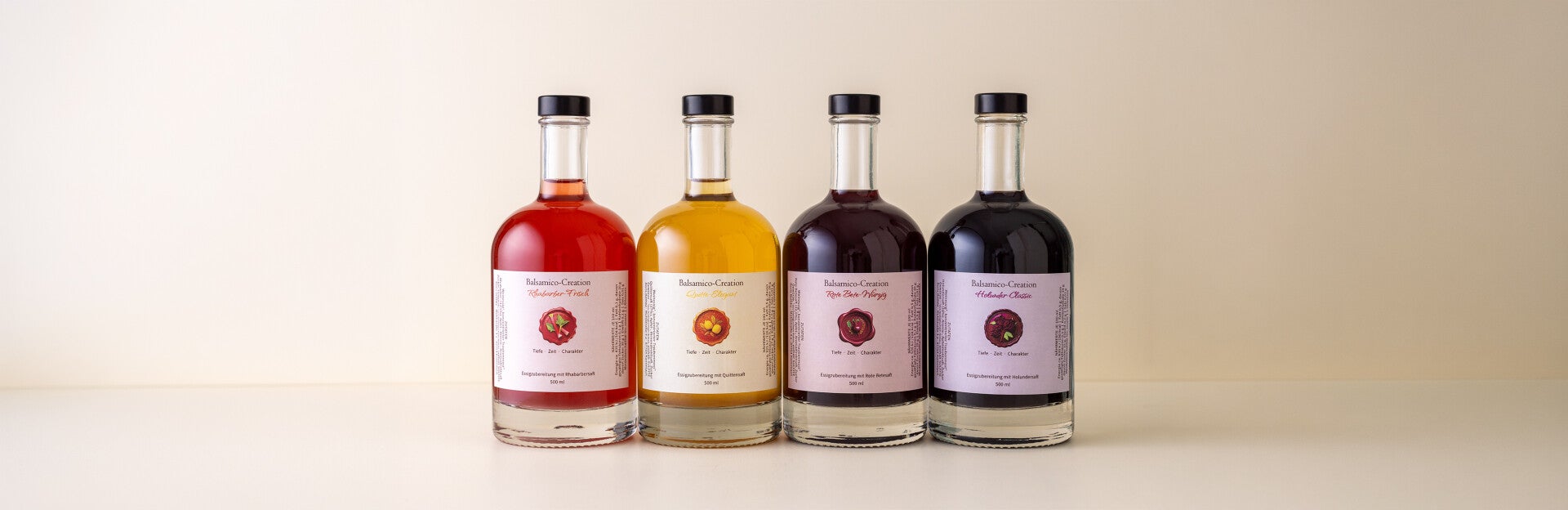 Vier Balsamico-Creationen mit eigenem Charakter – handwerklich hergestellt und fein aufeinander abgestimmt.